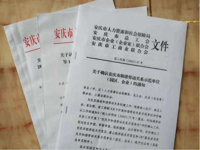 1月8日,市經(jīng)濟(jì)開(kāi)發(fā)區(qū)人社局組織召開(kāi)2020年度全區(qū)優(yōu)秀勞動(dòng)誠(chéng)信企業(yè)通報(bào)表彰大會(huì),我集團(tuán)公司斬獲“安慶市勞動(dòng)保障誠(chéng)信示范企業(yè)”、“安慶市勞動(dòng)保障誠(chéng)信評(píng)價(jià)A級(jí)企業(yè)”、“安慶市和諧勞動(dòng)關(guān)系示范單位”三項(xiàng)榮譽(yù)稱號(hào)。