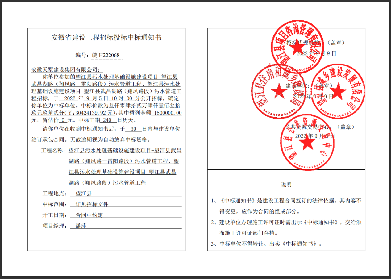 國慶節來臨之際,我司再獲中標喜訊。2022年9月5日,我司參加望江縣污水處理基礎設施建設項目招標,并成功中標,中標價為30424139.92 元。