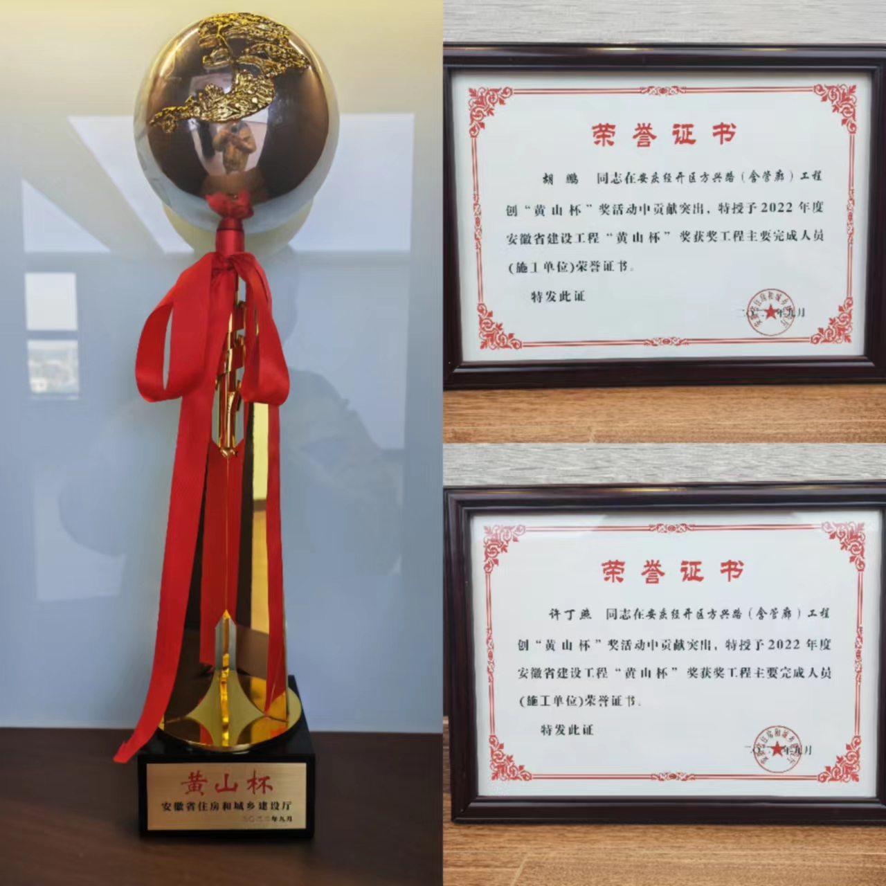 此外,升弘公司員工許丁照、胡鵬因在此次創(chuàng)獎(jiǎng)活動(dòng)中貢獻(xiàn)突出,被安徽省住房和城鄉(xiāng)建設(shè)廳特授予2022年度安徽省建設(shè)工程“黃山杯”獎(jiǎng)獲獎(jiǎng)工程主要完成人員(施工單位)榮譽(yù)證書(shū)。
