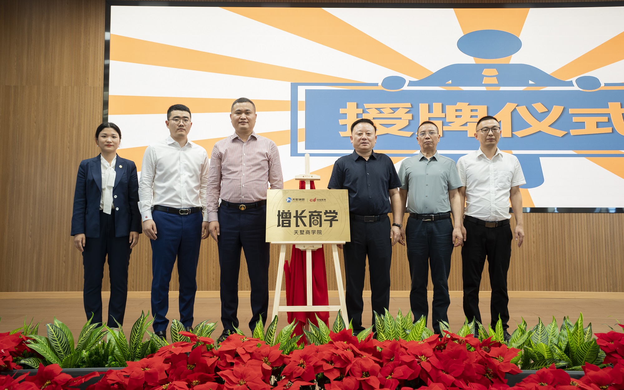 最后,由公司董事長和中旭教育華東大區總裁韓征明共同為天墅商學院揭牌,宣布天墅商學院正式成立,現場參會人員全體起立,掌聲不斷,慶祝天墅集團增長商學院啟動儀式取得圓滿成功!