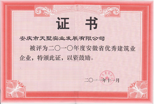 2009年我公司榮獲安慶市建筑業協會頒發的“安慶優秀建筑業企業”稱號之后,我公司再次榮獲由安徽省建筑業協會頒發的“安徽省優秀建筑業企業”稱號。