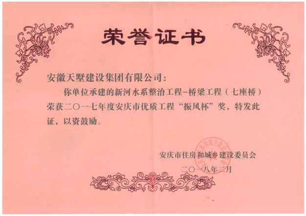 日前,由我司承建的安慶新河水系整治工程 — 橋梁工程(七座橋)經專家評定并予以公示,成功榮獲2017年度安慶市優質工程“振風杯”獎。