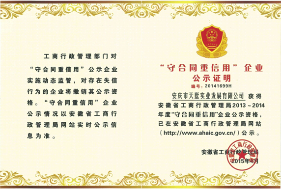 日前,經安徽省工商行政管理局審核批準,天墅實業正式取得2013-2014年度安徽省“守合同重信用”企業公示資格。